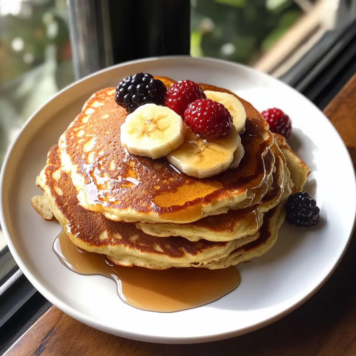 - Halte die Pancakes warm und serviere sie mit optionalem Topping.