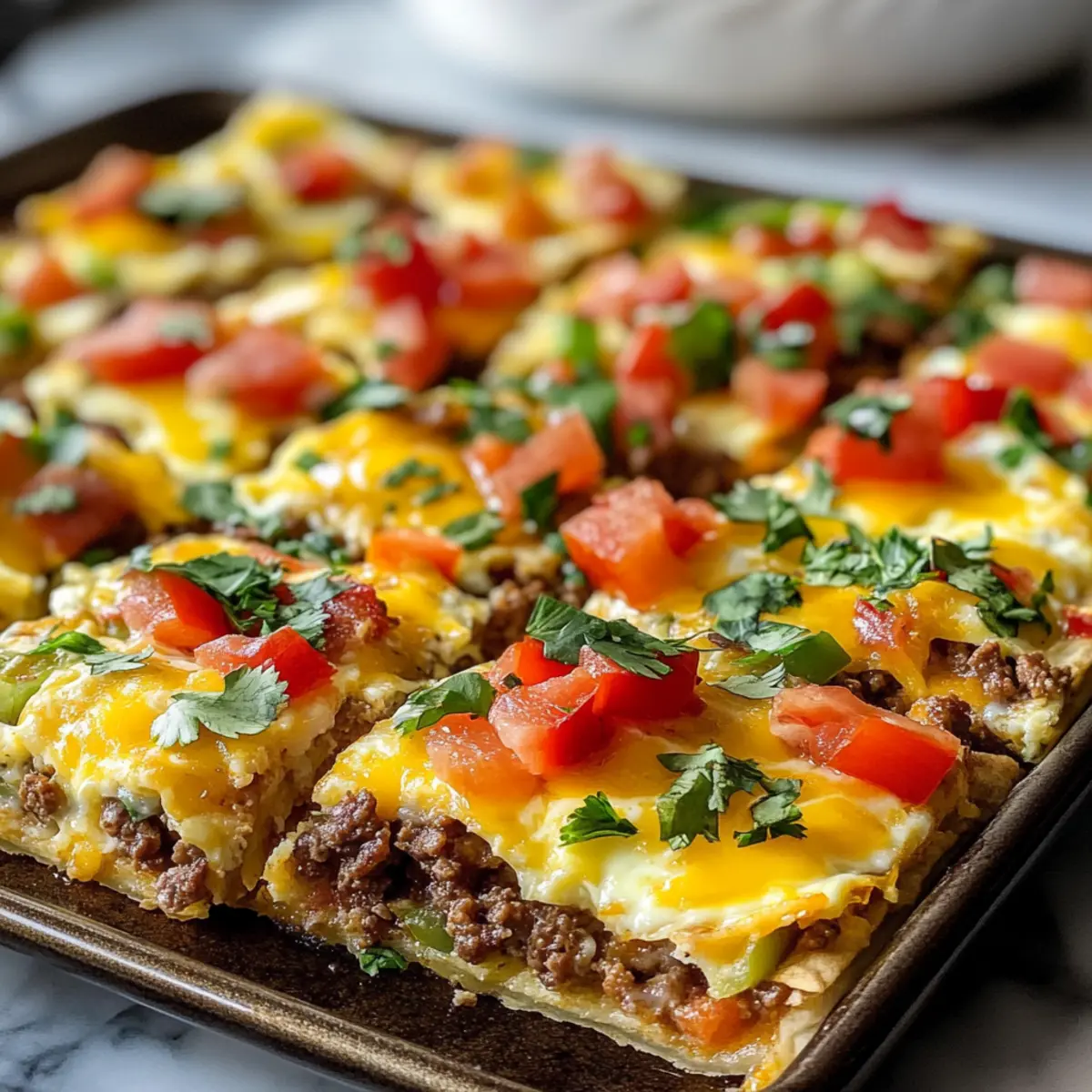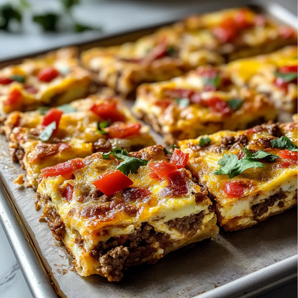 Vielseitigkeit: Diese Blechpfannen Frühstücksburrito Quadrate sind nicht nur einfach zuzubereiten, sondern lassen sich auch nach Lust und Laune anpassen. Fügen Sie Ihre Lieblingsgemüse oder verschiedene Käsesorten hinzu, um eine persönliche Note zu kreieren. Zeitersparnis: Ideal für hektische Morgen, da Sie die Quadrate im Voraus vorbereiten und sie schnell im Ofen aufbacken können. Sättigende Füllung: Mit einer Kombination aus fluffigen Rühreiern und würzigem Hackfleisch sind diese Quadrate eine wahre Geschmacksbombe. Crowd-Pleaser: Perfekt für Frühstücksbrunches mit Freunden oder die ganze Familie! Wer kann da schon widerstehen? Machen Sie sich bereit, die Frühstückstradition neu zu definieren!
