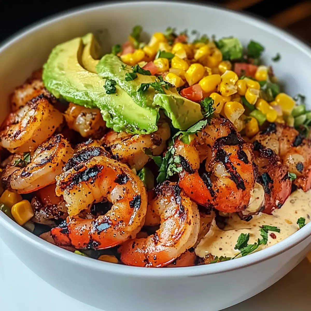 Gegrillte Garnelen-Schale mit Avocado und Mais-Salsa