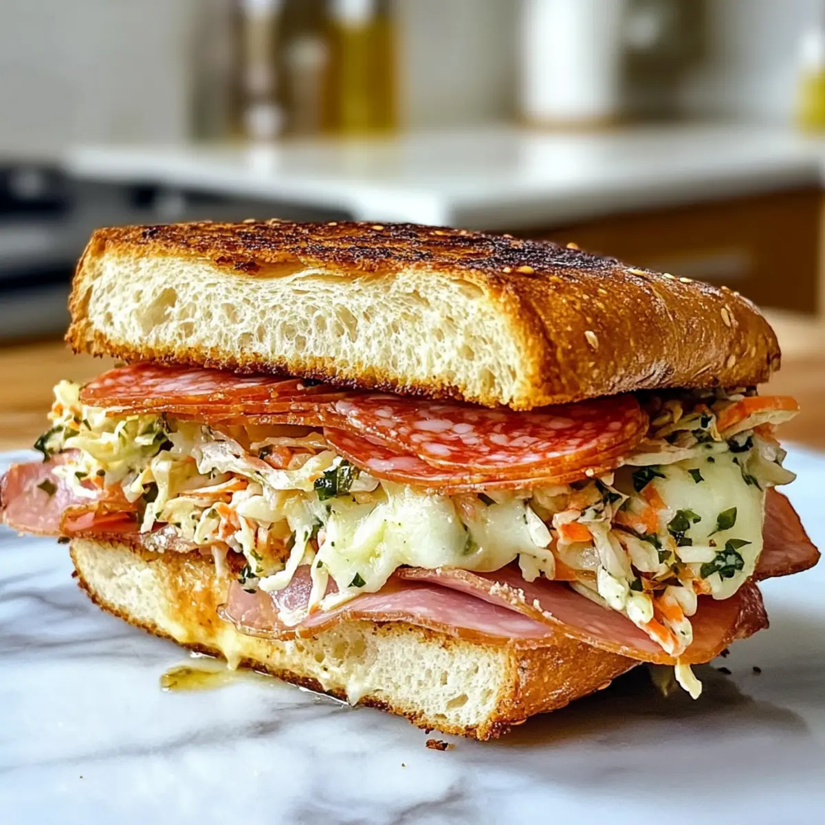 Knusprige Textur: Die Kombination aus geröstetem Ciabatta und knusprigem Coleslaw macht jeden Biss unvergesslich.