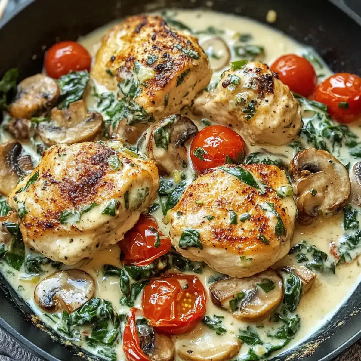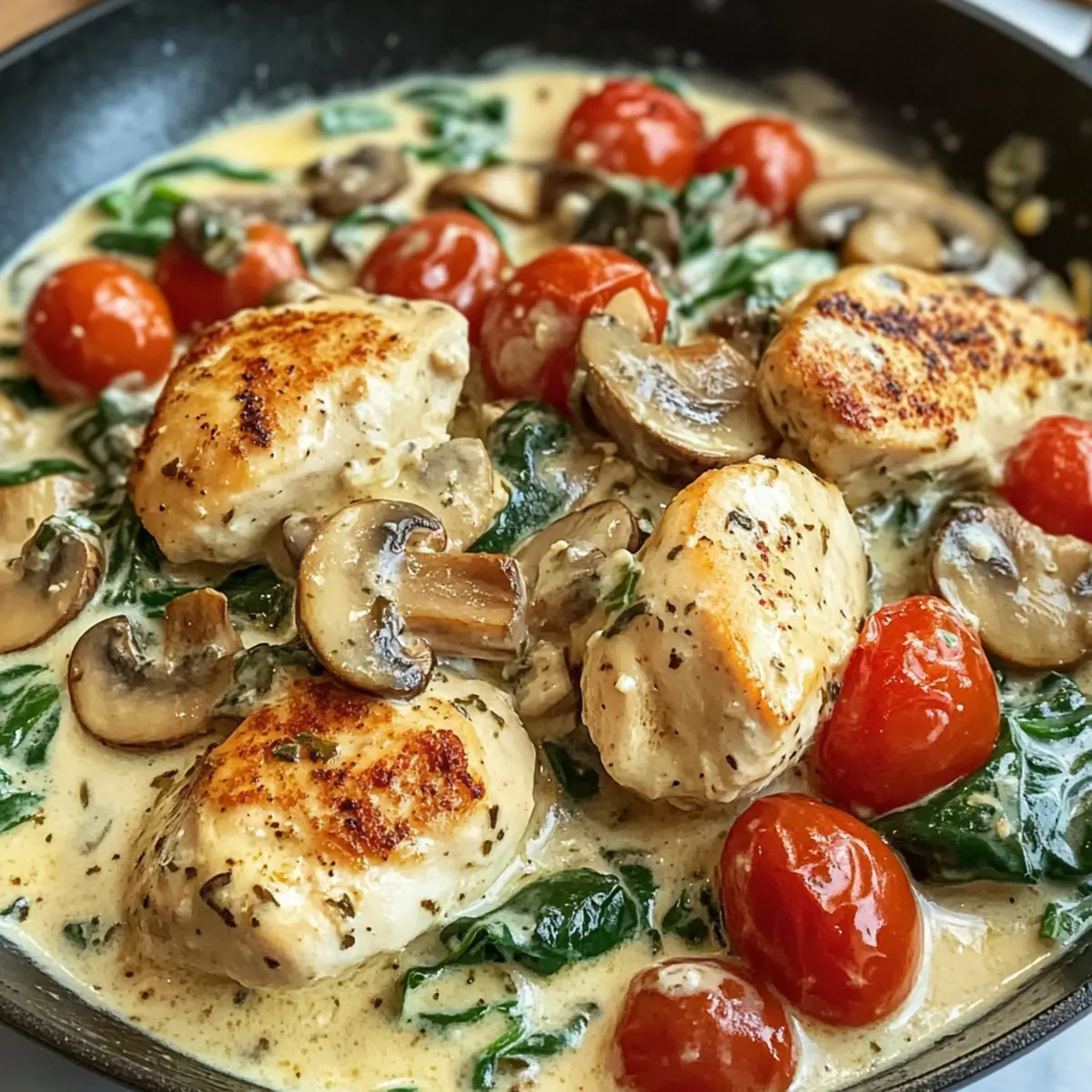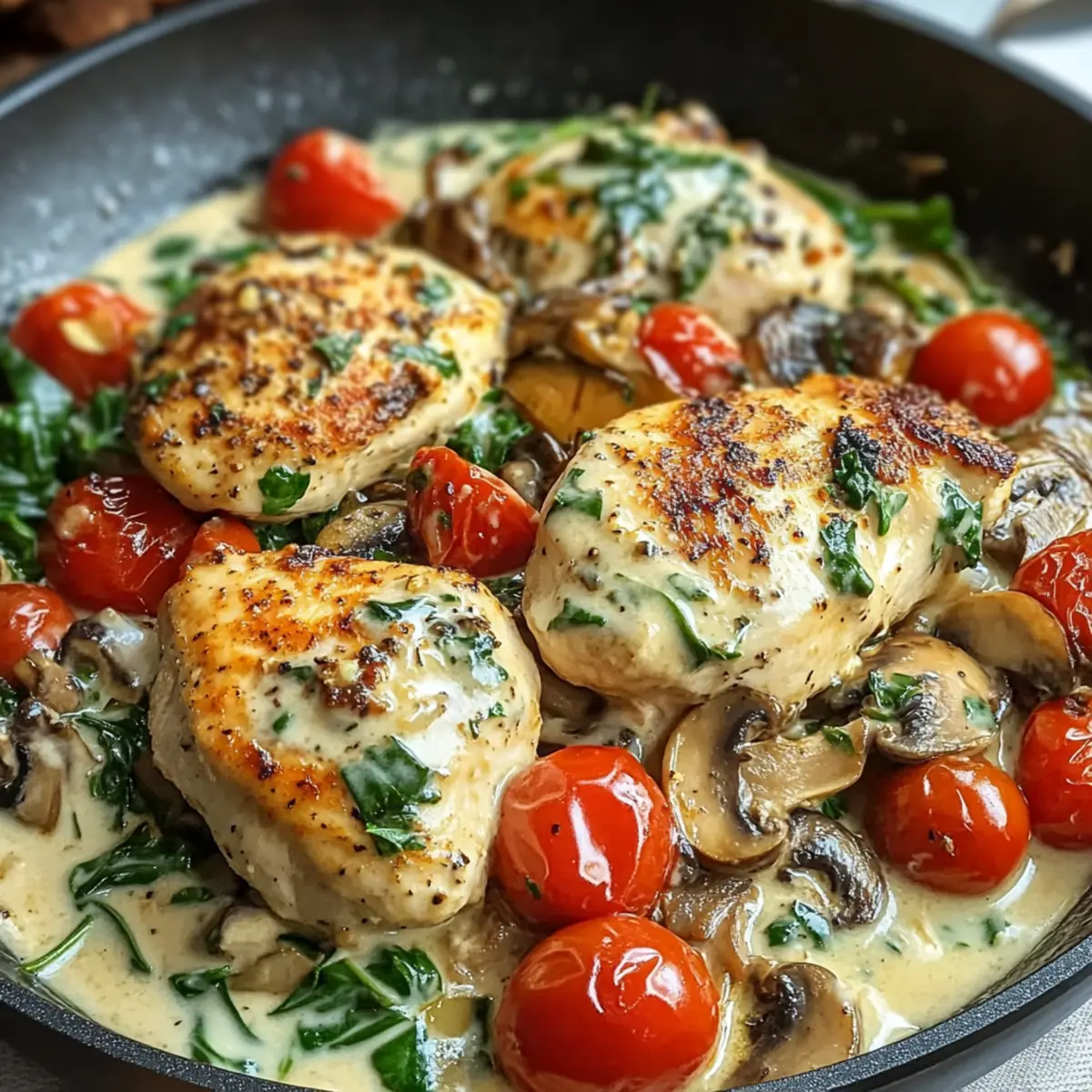 Das Zubereiten dieser cremigen mediterranen Hähnchenpfanne kann entscheidend zur Zeitersparnis an einem hektischen Abend beitragen! Ihr könnt die Hähnchenstücke bereits bis zu 24 Stunden im Voraus marinieren und im Kühlschrank aufbewahren, damit sie die Aromen gut aufnehmen. Auch die Gemüse wie Pilze, Kirschtomaten und Spinat lassen sich vorbereiten; schneidet sie einfach und lagert sie in einem luftdichten Behälter für bis zu 3 Tage. Am Tag der Zubereitung müsst ihr nur das Hähnchen anbraten, das vorbereitete Gemüse hinzugeben und die einfache Sauce zubereiten. 🔥 Dies hält die Zutaten frisch und geschmackvoll, sodass ihr am Ende dennoch die fantastische Qualität der cremigen mediterranen Hähnchenpfanne genießen könnt – genauso lecker wie frisch zubereitet!