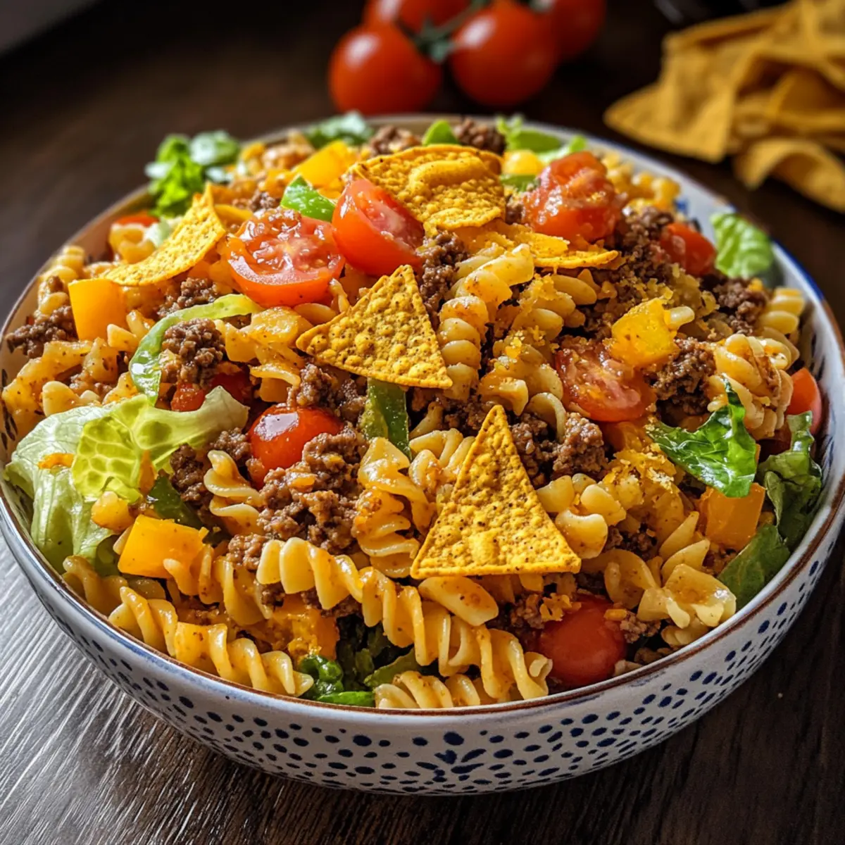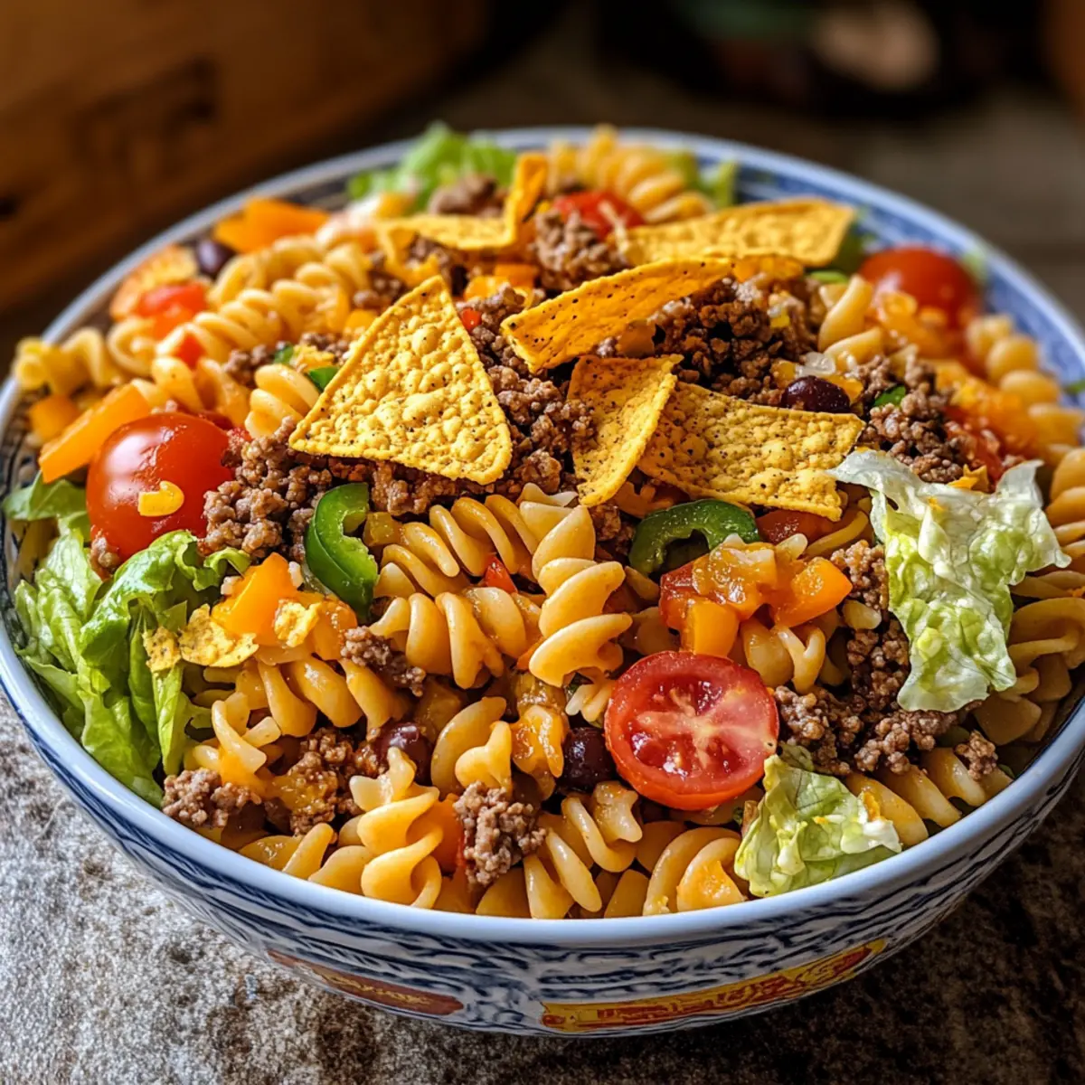 Zaubere diesen köstlichen Doritos Locos Taco Nudel Salat und genieße die Freude und den Geschmack, die er bei deinen Treffen bringt!