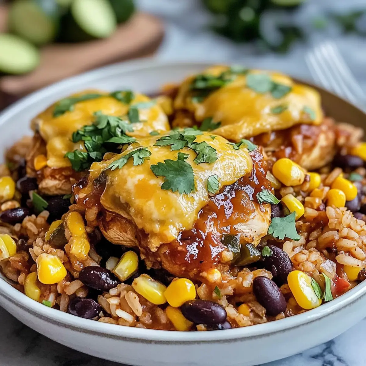 Servieren Sie Ihr Ein-Topf BBQ Hähnchen und Reis warm, garniert mit frischer Avocado, gewürfelten Tomaten und gehacktem Koriander oder Petersilie. Diese frischen Zutaten verleihen Ihrem Gericht eine lebendige Note!
