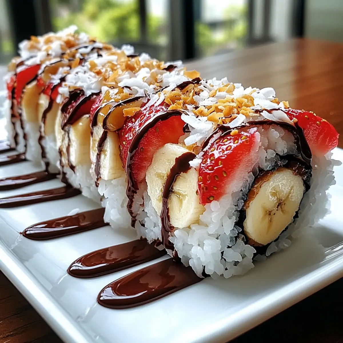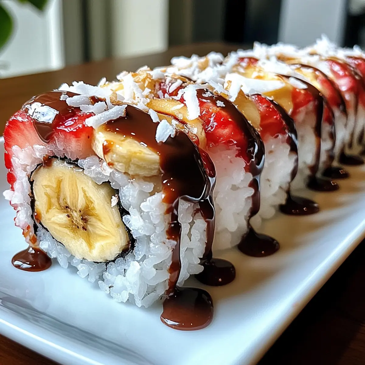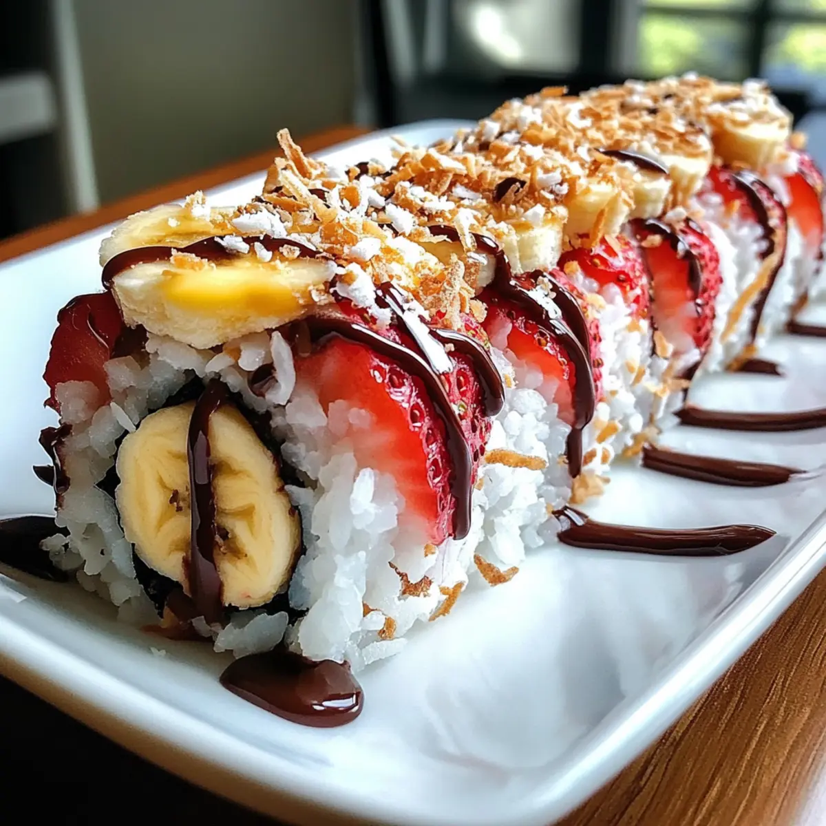 Die Erdbeer-Sushi-Dessertrolle ist ideal für die Vorbereitung im Voraus! Sie können den Sushi-Reis bis zu 24 Stunden vorher zubereiten und im Kühlschrank aufbewahren, damit er frisch bleibt. Auch die geschnittenen Früchte wie Erdbeeren und Bananen lassen sich bereits am Vortag vorbereiten; um eine Braunfärbung der Bananen zu vermeiden, beträufeln Sie sie einfach mit etwas Zitronensaft. Wickeln Sie die fertigen Rollen nach dem Formen in Frischhaltefolie und lagern Sie sie im Kühlschrank, wo sie bis zu 2-3 Tage haltbar sind. Wenn es Zeit zum Servieren ist, schneiden Sie die Rollen in Stücke, rollen Sie diese in Kokosflocken und beträufeln Sie sie mit Schokoladensauce. So haben Sie im Handumdrehen ein köstliches Dessert, das einfach genauso lecker bleibt!
