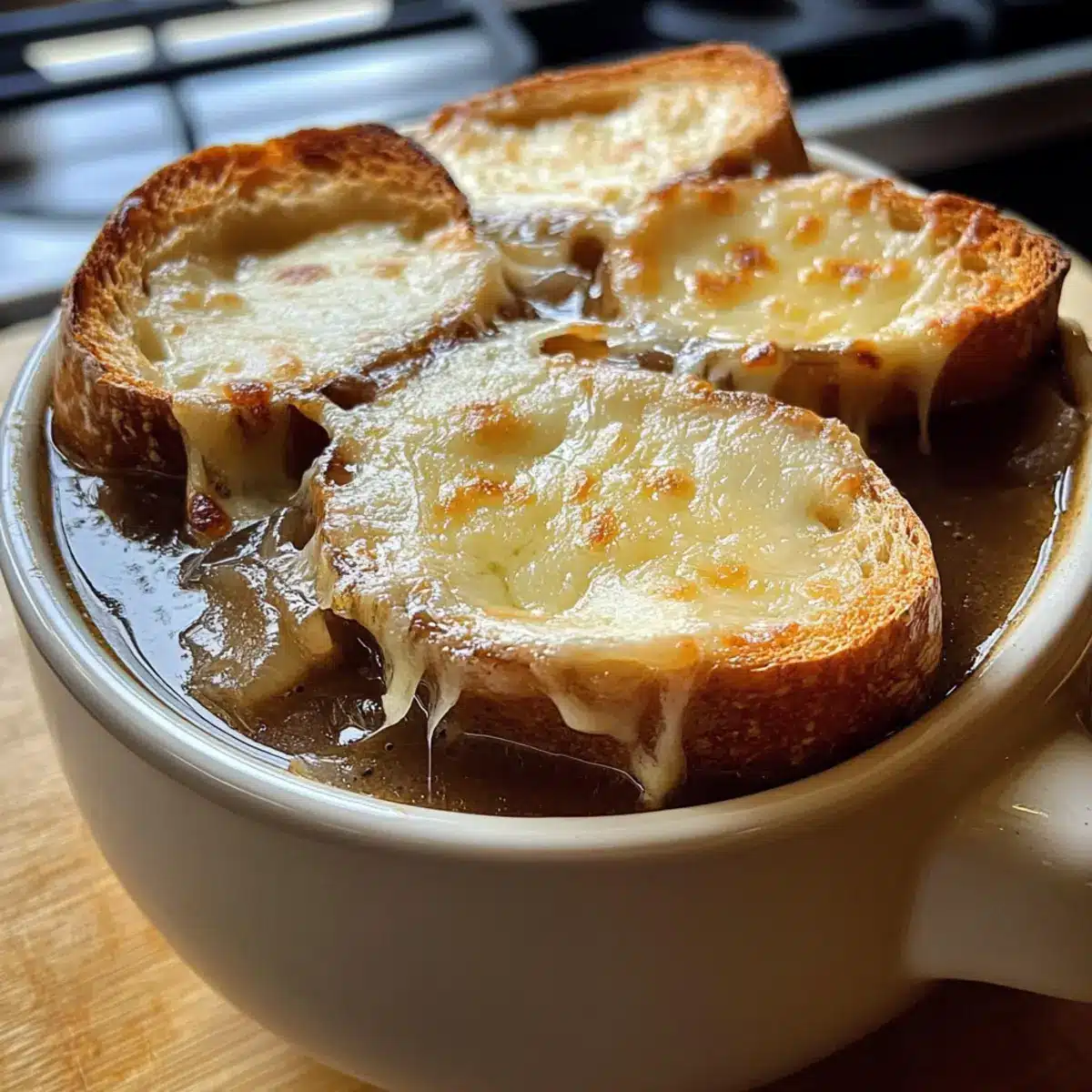 Vegetarische Option: Ersetzen Sie die Rinderbrühe durch Gemüse- oder Pilzbrühe für eine köstliche vegetarische Variante der erstaunlichen französischen Zwiebelsuppe.