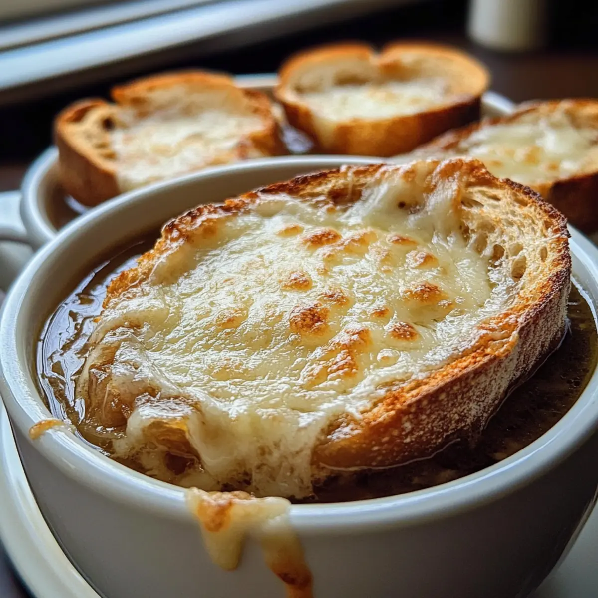 - Suppe überbacken: Füllen Sie Schalen mit Suppe und belegen Sie sie mit Baguette-Scheiben.