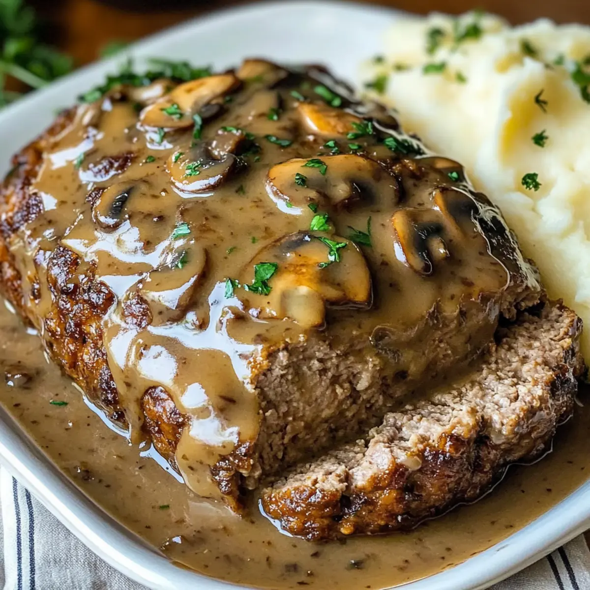 - Die Champignonsoße über den Fleischlaib in der Backform gießen. Etwa 1 Stunde backen, bis das Innere eine Temperatur von 71°C erreicht hat.