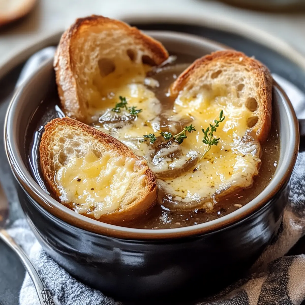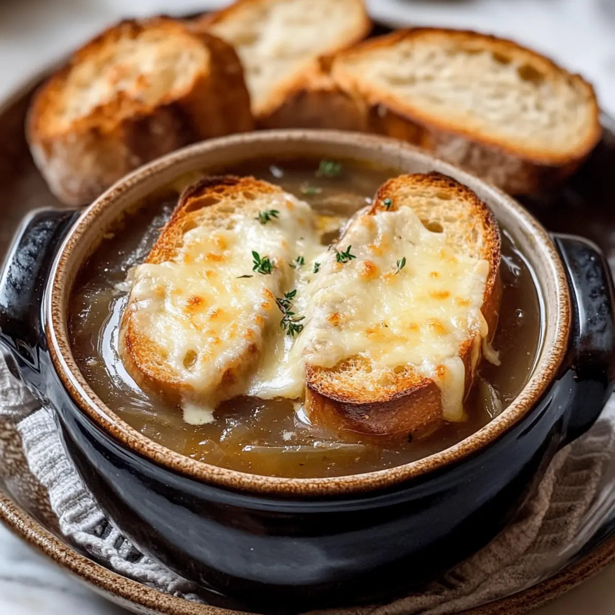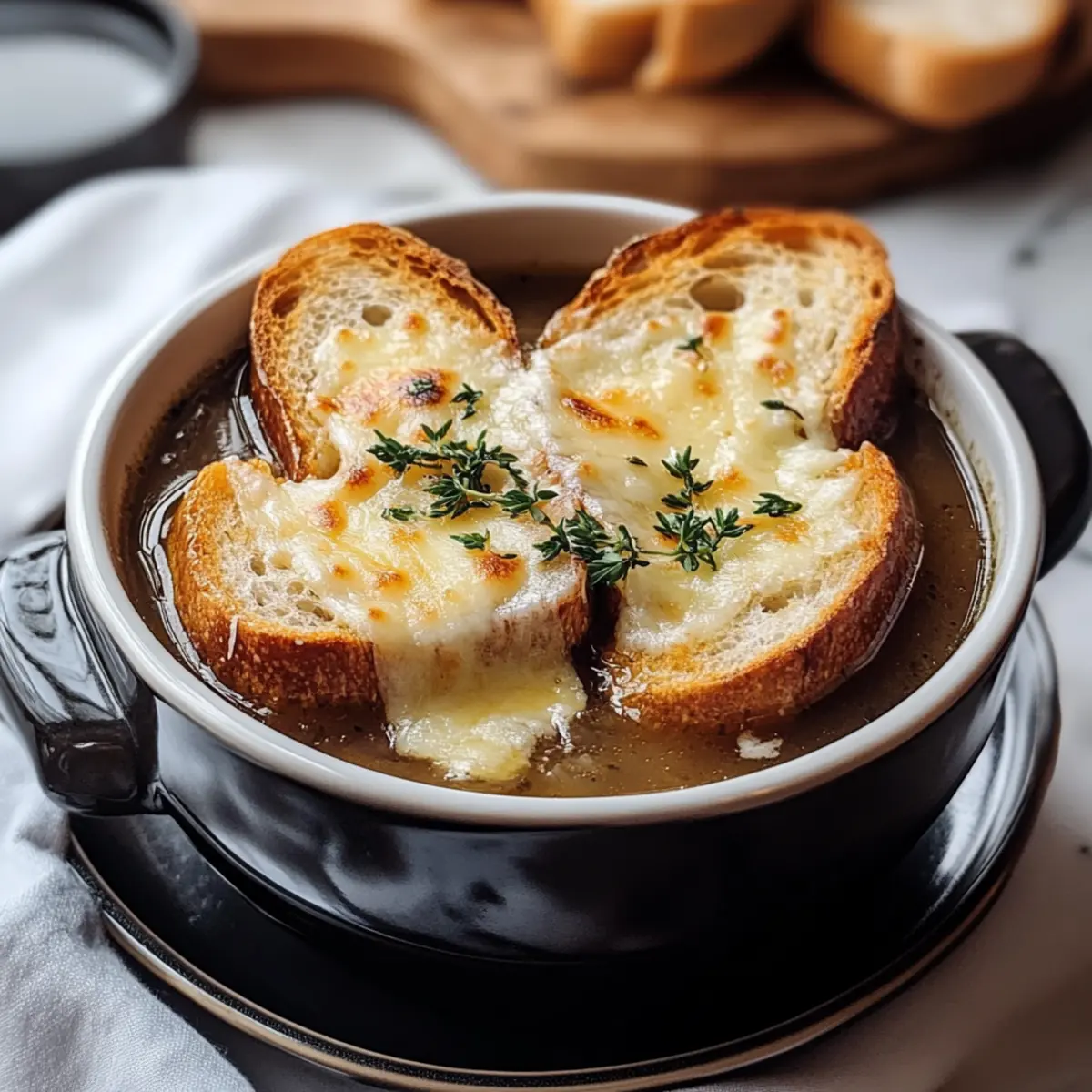 Französische Zwiebelsuppe mit Käsebaguettes für Soulfood