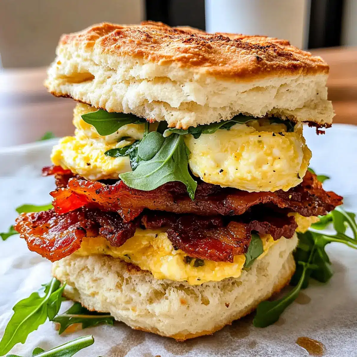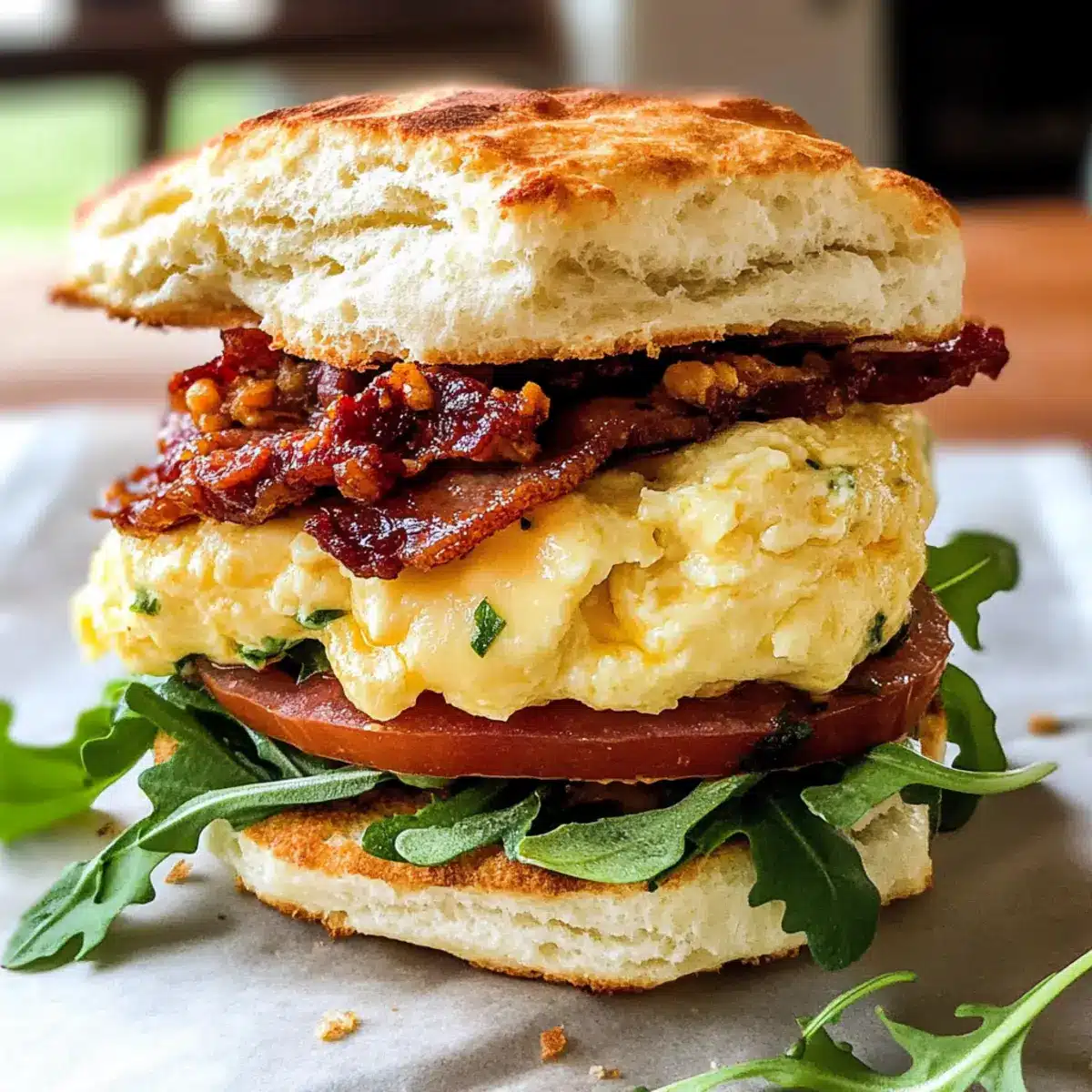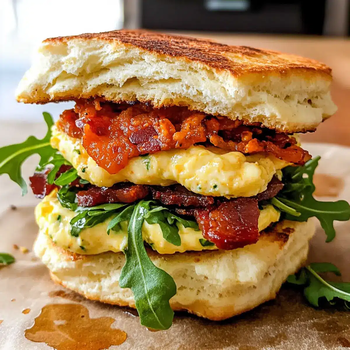 Sobald die Brötchen fertig gebacken und die Rühreier zubereitet sind, ist es Zeit zum Zusammenstellen der Mediterranean Breakfast Sandwiches. Schneide die warmen Brötchen auf und verteile einen großzügigen Löffel der sonnengetrockneten Tomaten-Aioli auf die untere Hälfte. Lege zwei Scheiben knusprigen Speck, eine Portion Rührei und eine Handvoll Baby-Argula oder Spinat darauf. Optional kannst du etwas Guacamole hinzufügen, bevor du die obere Brötchenhälfte daraufsetzt.
