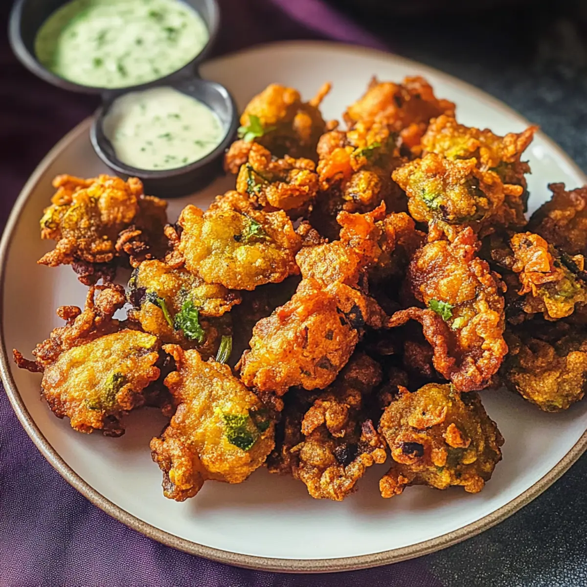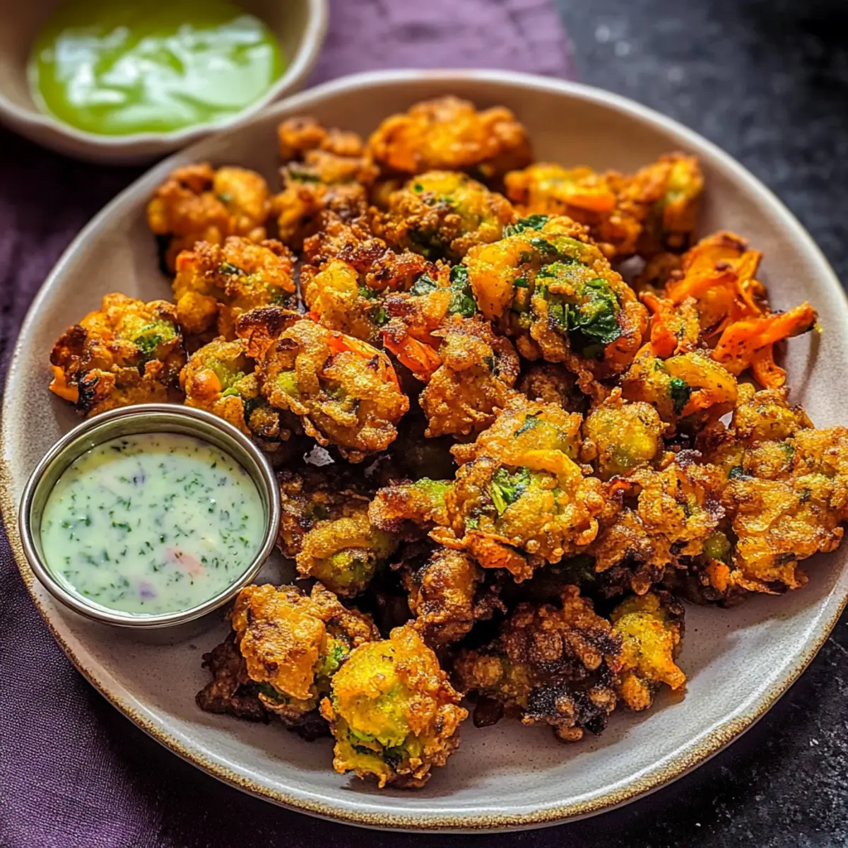 Die knusprigen Gemüse-Pakoras sind der perfekte Snack, der ein Fest für die Sinne bietet und wunderbar mit verschiedenen Beilagen harmoniert.