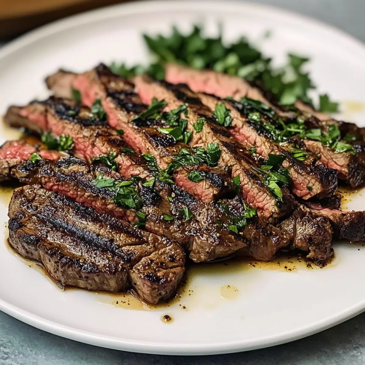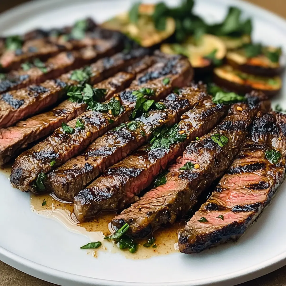 Schneide das Steak schräg in dünne Scheiben gegen die Faser. Serviere es zusammen mit gegrilltem Gemüse, frischem Salat oder gerösteten Kartoffeln für ein ausgewogenes Gericht. Mit frischen Kräutern bestreuen, um dem Gericht eine aromatische Note zu verleihen.