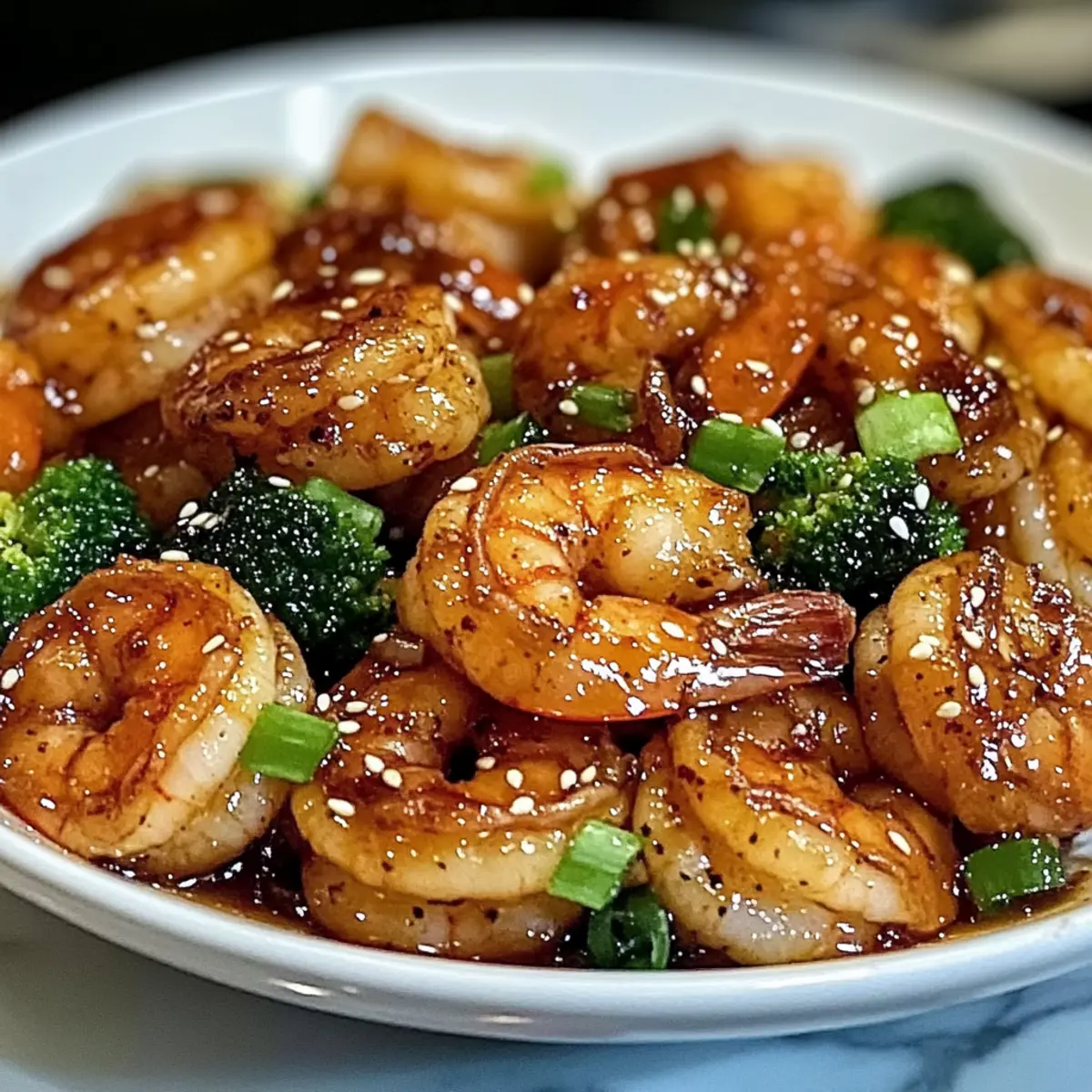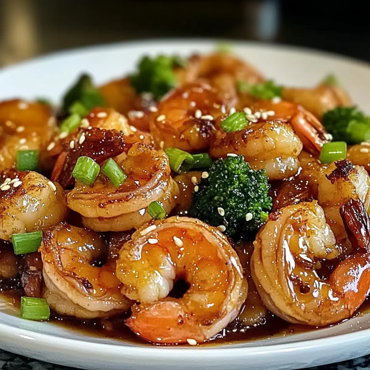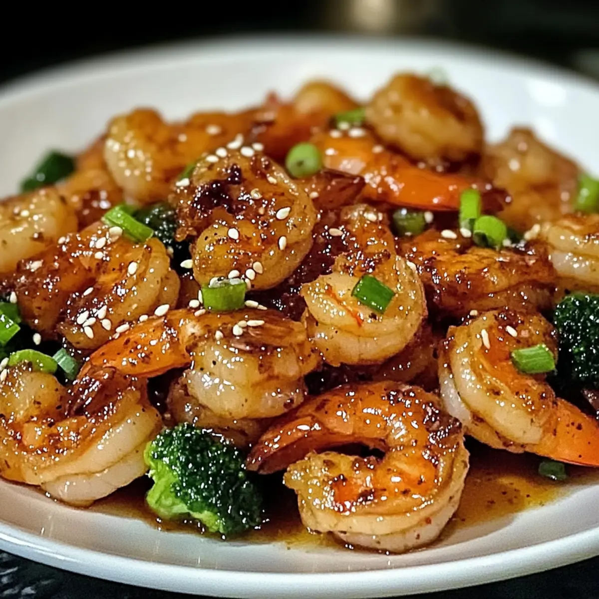 - Serviere die Garnelen auf einem Teller und garniere mit Frühlingszwiebeln und Sesamsamen.