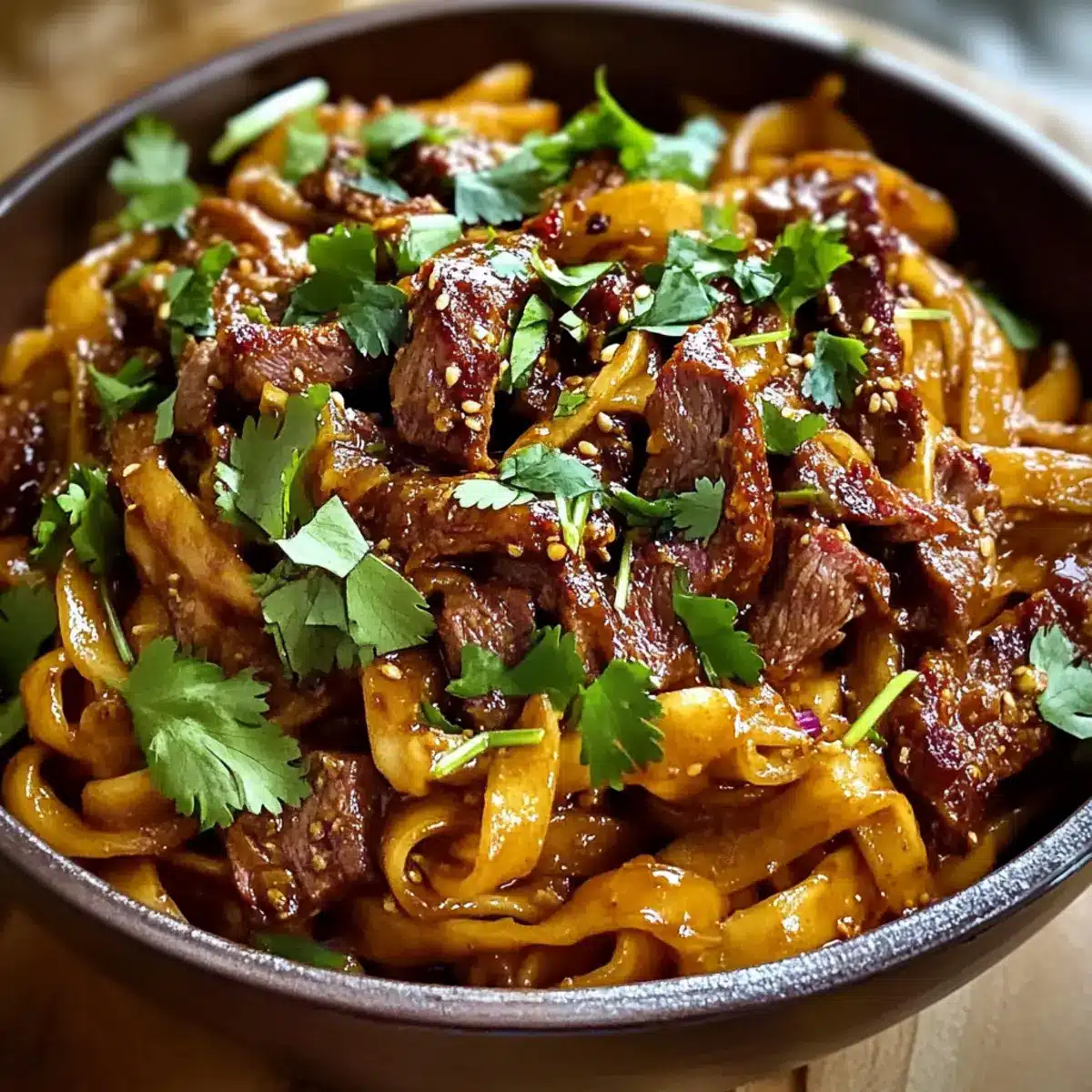 - Nimm die Pfanne vom Herd und garniere die Kümmel Lamm Nudeln mit frisch gezupften Korianderblättern. Serviere das Gericht sofort.