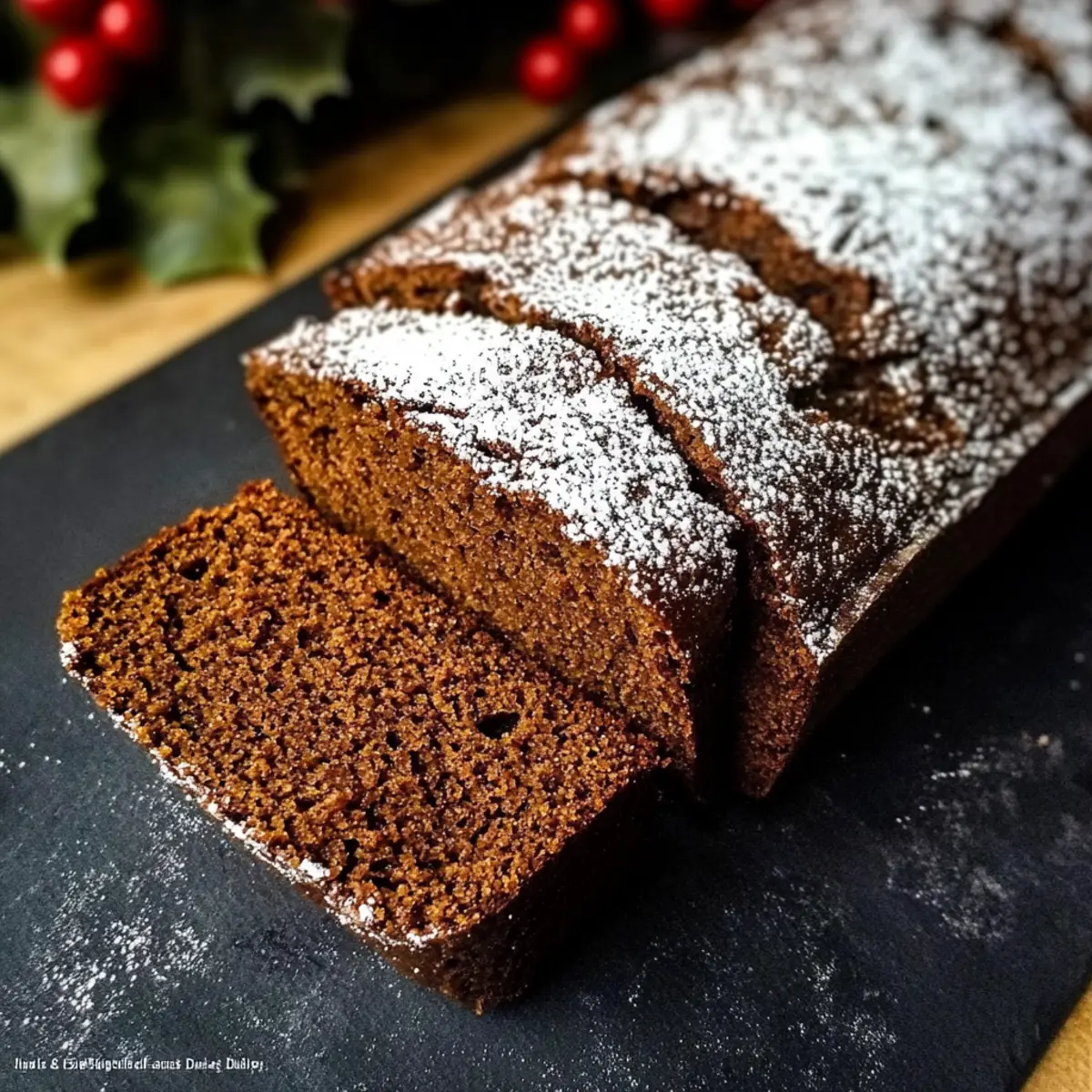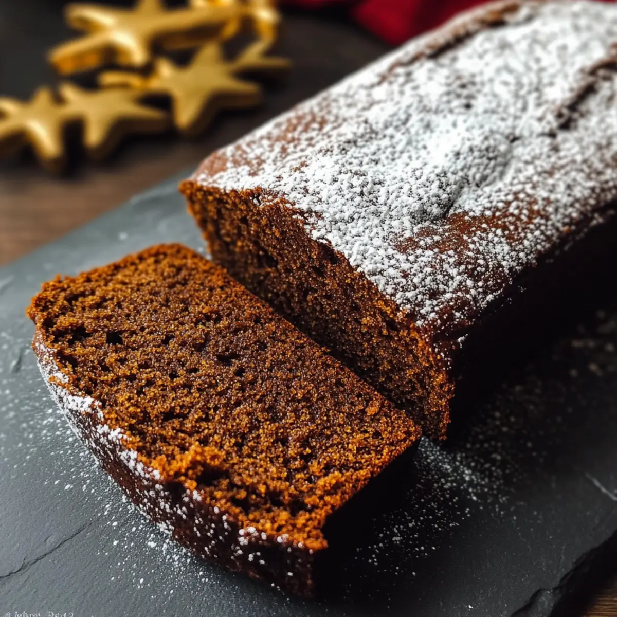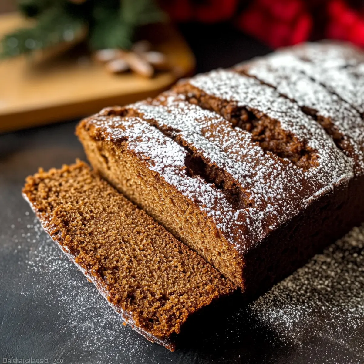 Für eine köstliche Verzierung empfiehlt es sich, das fertige Lebkuchenbrot mit Puderzucker zu bestäuben, um den festlichen Charakter zu unterstreichen.