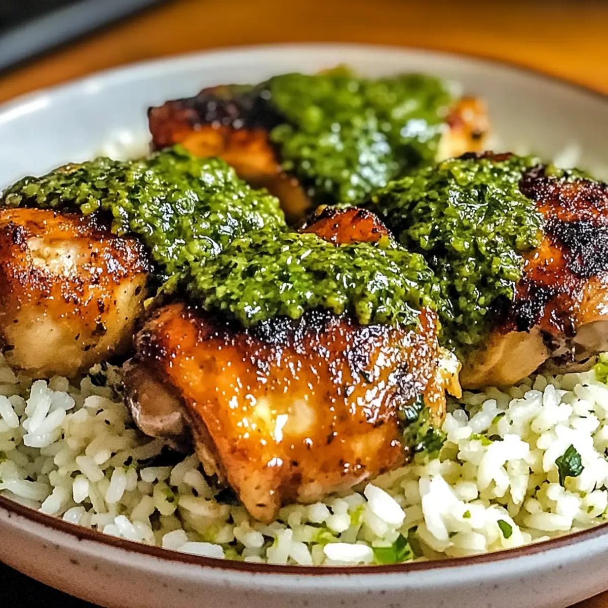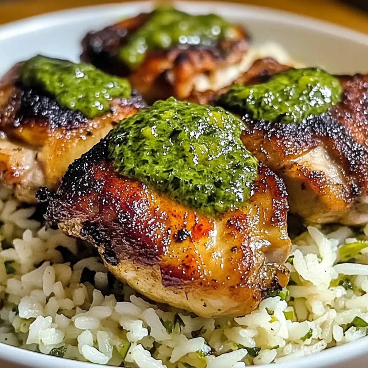 - Das Hähnchen und den Reis anrichten und die Aji Verde Sauce über das Hähnchen träufeln.