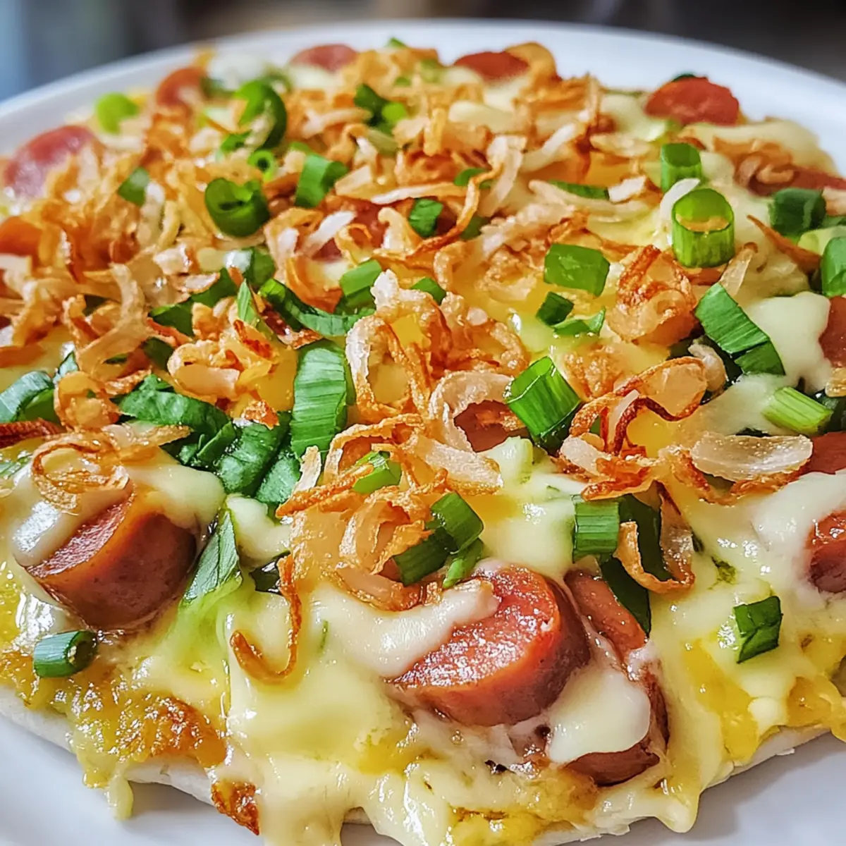 Füge die geschnittenen Hotdogs oder Würstchen und die frittierten Schalotten hinzu. Mische die Zutaten vorsichtig, sodass sie in der Käseschicht versenkt sind. Das verleiht deiner Pizza noch mehr Geschmack und Textur.