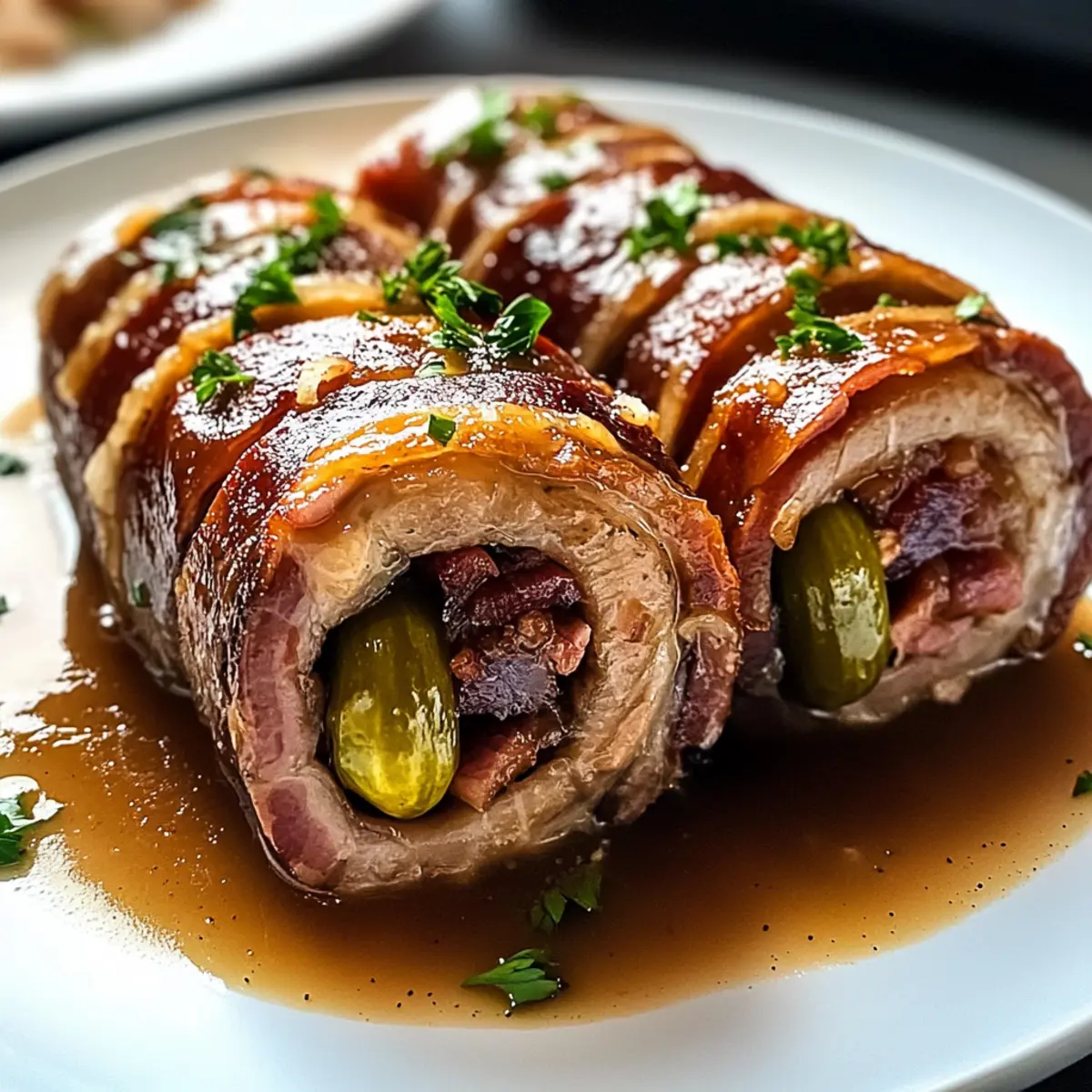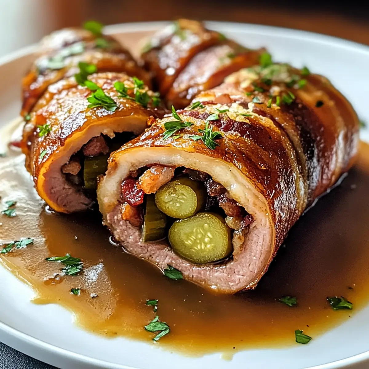 Richte die Füllung gleichmäßig an: Achte darauf, dass die Füllung aus Speck, Gurken und Zwiebeln gleichmäßig verteilt ist, um sicherzustellen, dass jede Scheibe der Rinderroulade voll von Geschmack ist.