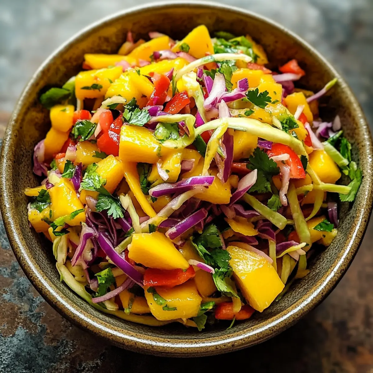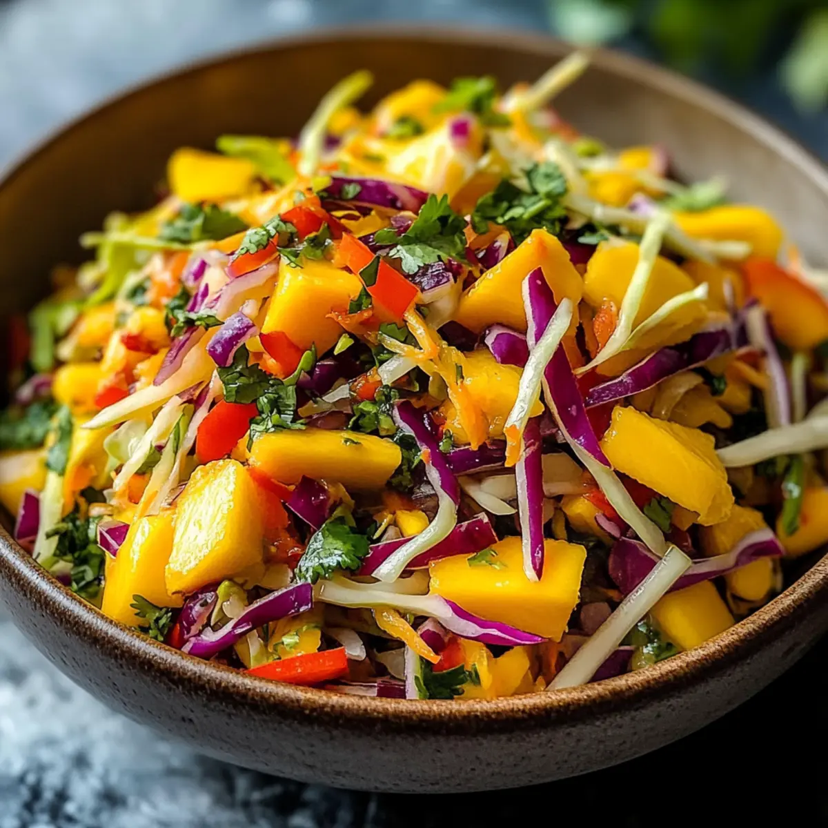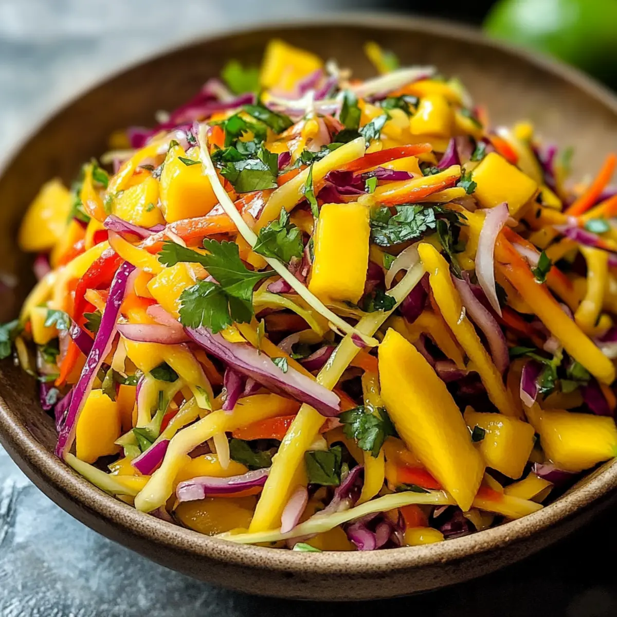 Frische Farben: Dieser Mango-Slaw ist ein wahres Fest für das Auge! Die leuchtenden Farben der frischen Zutaten machen ihn zu einem Hingucker auf jedem Tisch.
