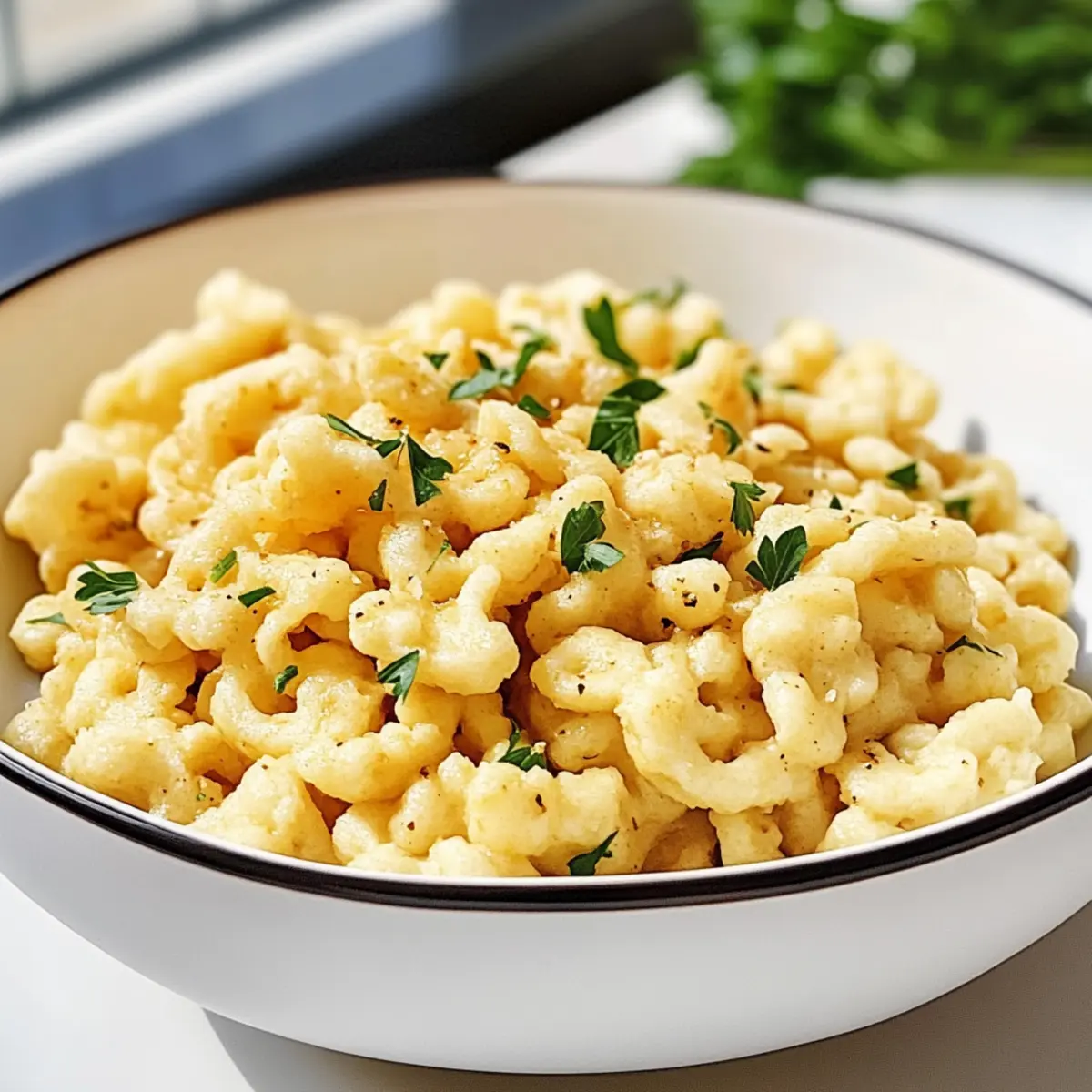 - Garnieren die Spätzle mit frischer, gehackter Petersilie und serviere sie.