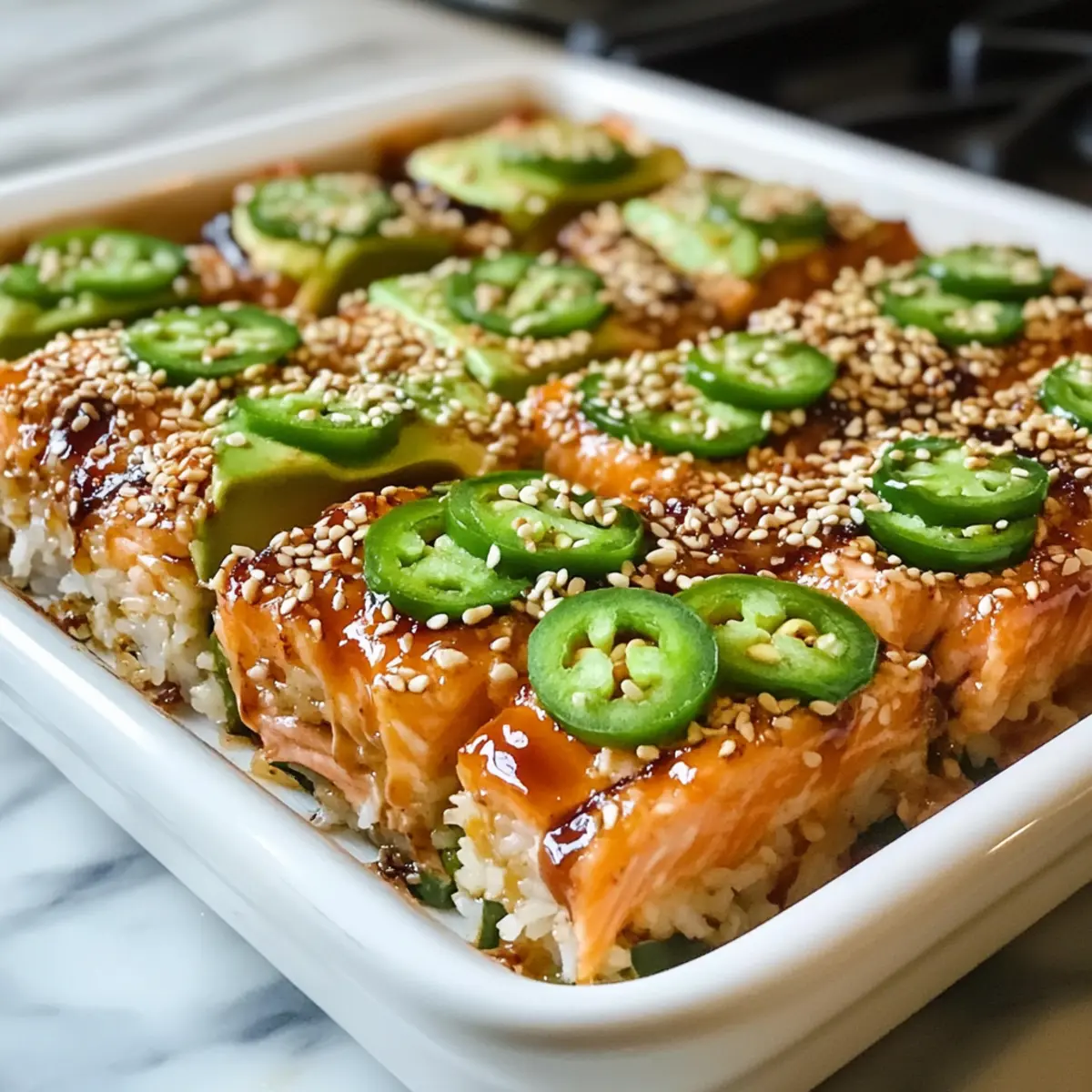 Einfache Zubereitung: Die Schritte sind unkompliziert und erfordern keine besonderen Kochkünste. Vielseitig: Dieser Auflauf lässt sich leicht anpassen—tauschen Sie den Lachs gegen Thunfisch oder Garnelen aus. Harmonische Aromen: Die Kombination aus gebackenem Lachs, würziger Mayo und süßer Eel-Sauce sorgt für ein unvergessliches Geschmackserlebnis. Perfektes Gericht für gesellige Abende: Ideal für gemeinsame Mahlzeiten mit Familie und Freunden—ein echter Publikumsliebling! Wenig Aufwand, großer Genuss: Schnell und ohne viel Aufwand zubereitet, bleibt mehr Zeit zum Genießen. Diese perfekt cremige Kombination wird nicht nur Sushi-Liebhaber begeistern, und wenn Sie mehr über kreative Sushi-Variationen erfahren möchten, schauen Sie sich auch unser Rezept für Uramaki Sushi an!