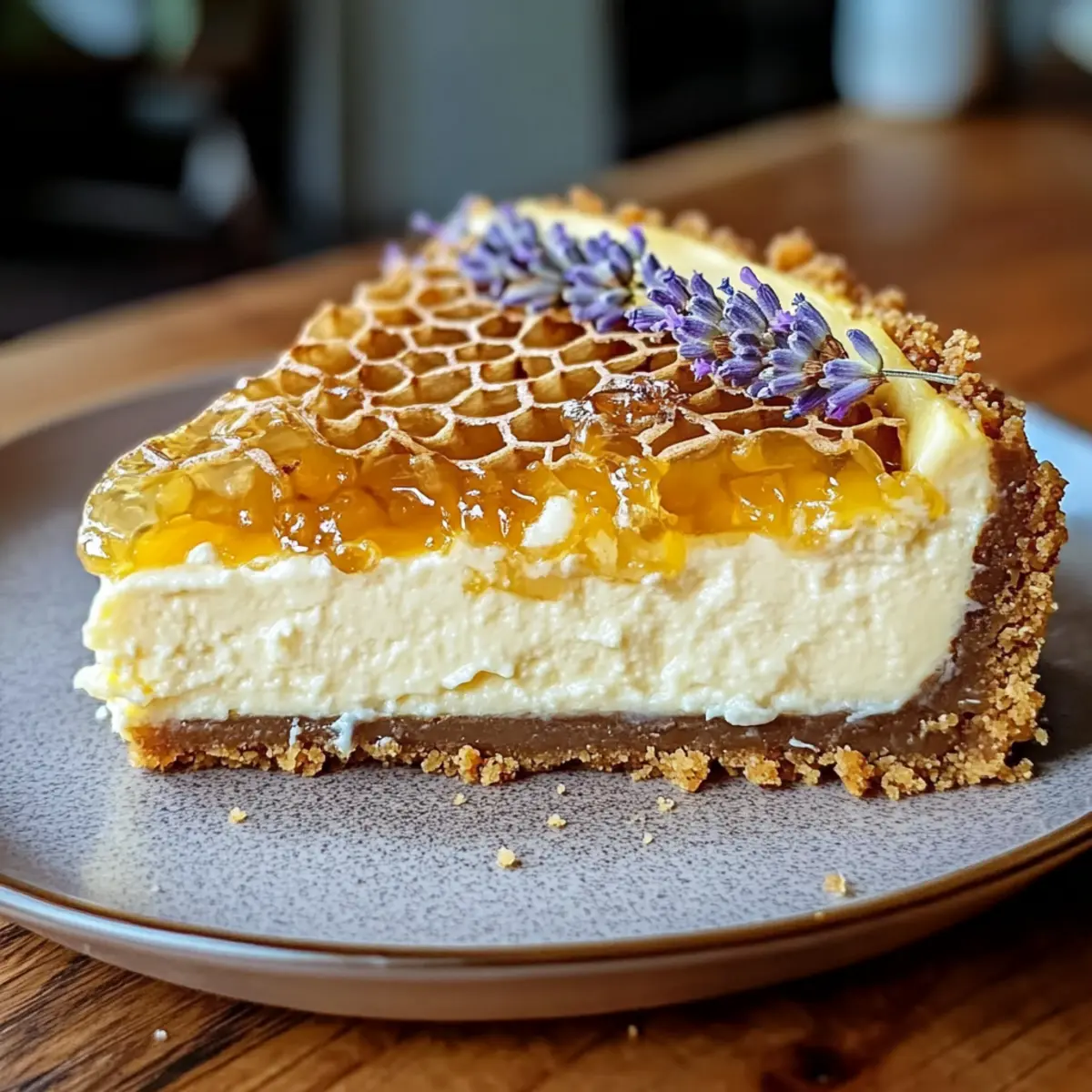 Aufwärmen: Für eine cremigere Textur kannst du den Käsekuchen leicht bei Zimmertemperatur anwärmen, bevor du ihn mit frischen Honigwaben garnierst.